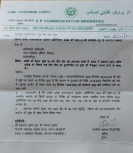 CRS तिलहर/शाहजहाँपुर-तिलहर नगर पालिका परिषद के अधिशासी अधिकारी को, अल्पसंख्यक आयोग ने 10 अप्रेल 22 को साक्ष्यो का साथ आयोग के समक्ष हाजिर होने का नोटिस भेज दिया! मामला नगर के मो० कच्चा कटरा स्थित मदरसा शमसिया फैजाने हाथम के पास पैतृक सम्पत्ति से जबरन टीन शेड उखाड़ फेकने का बताया जा रहा है!